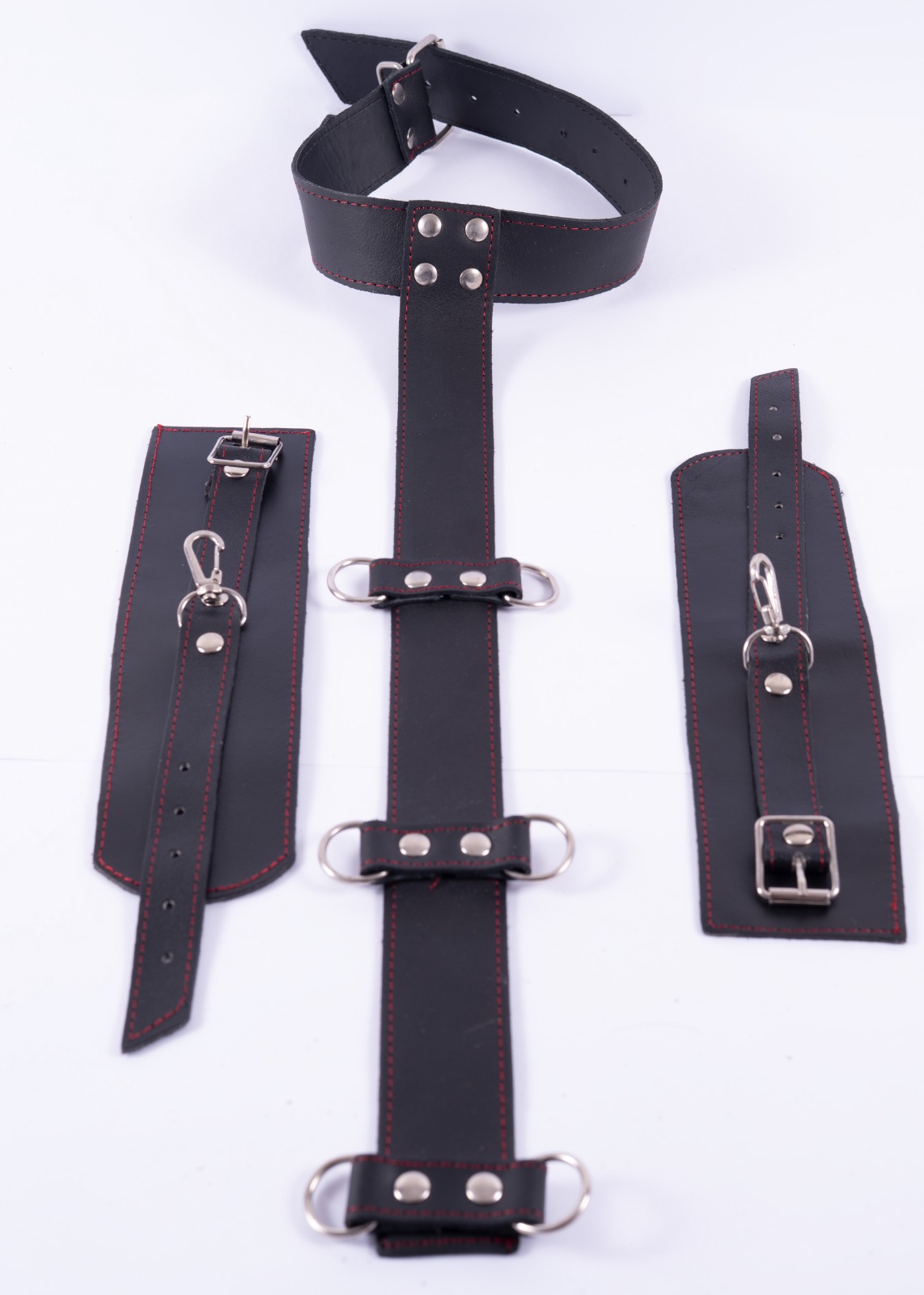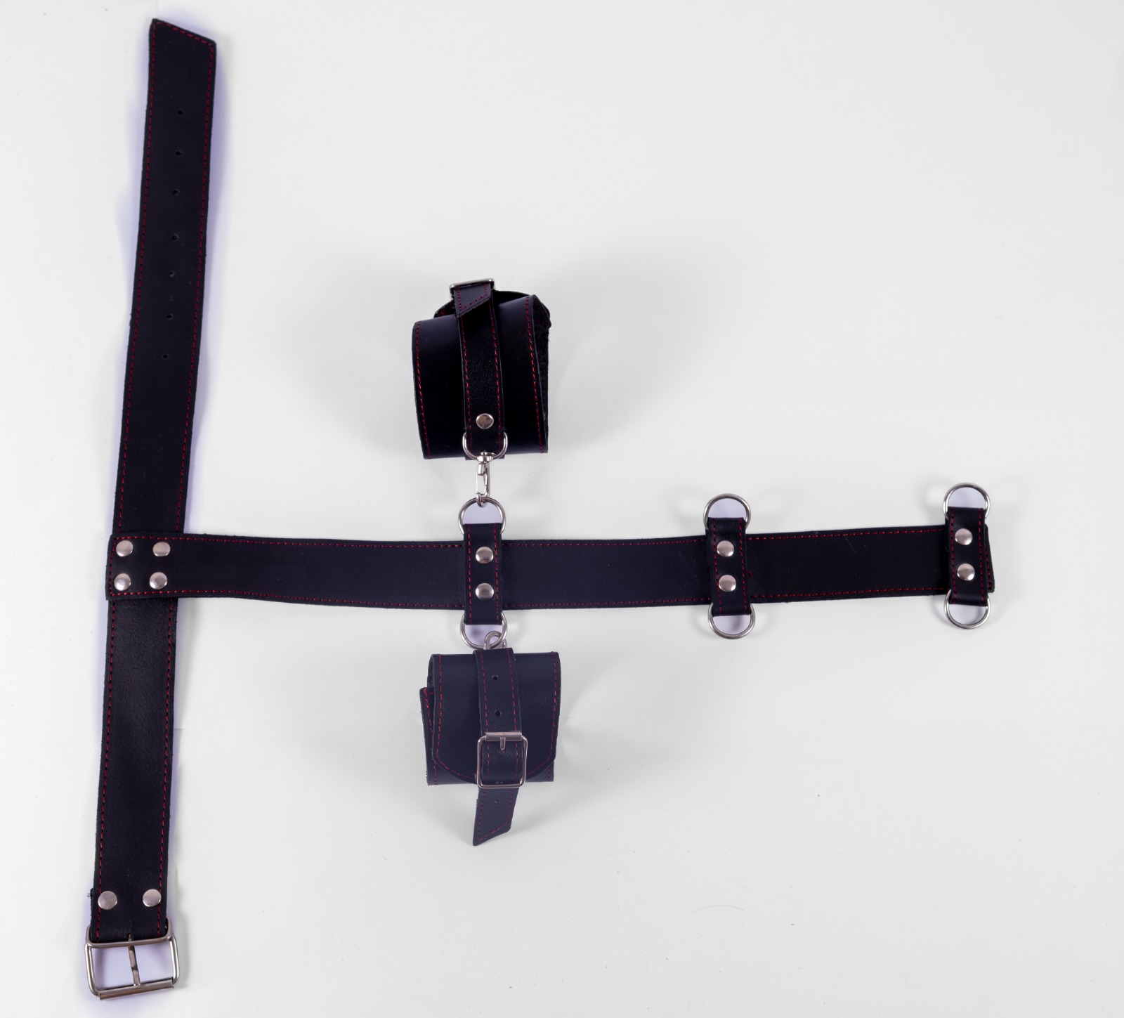 Fuerte pero placentero. Dejate dominar por las garras del placer. Arnes con collar y 2 esposas regulables con mosquetón. Posee 6 arandelas metálicas a los lados para enganchar esposas o sogas bondage y dejar volar tu imaginación. Fabricado en cuero.