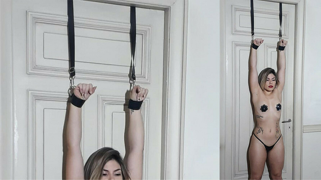 Kit que limita la sujeción de las manos. Largo ajustable desde el borde superior de la puerta a la mano. Las esposas también se ajustan al tamaño de las muñecas brindando mayor seguridad. Dale a tu amante una experiencia distinta y divertida.