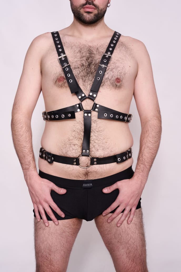 Arnés pechera con arandelas y remaches. Este arnés posee regules para el talle. Fabricado en cuero con tachas y arandelas de acero, totalmente regulable.