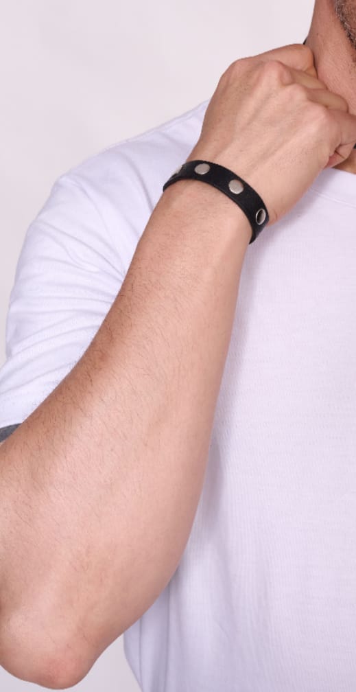 Pulsera de ecocuero con remaches. Puede ser adaptada a distintos tamaños.