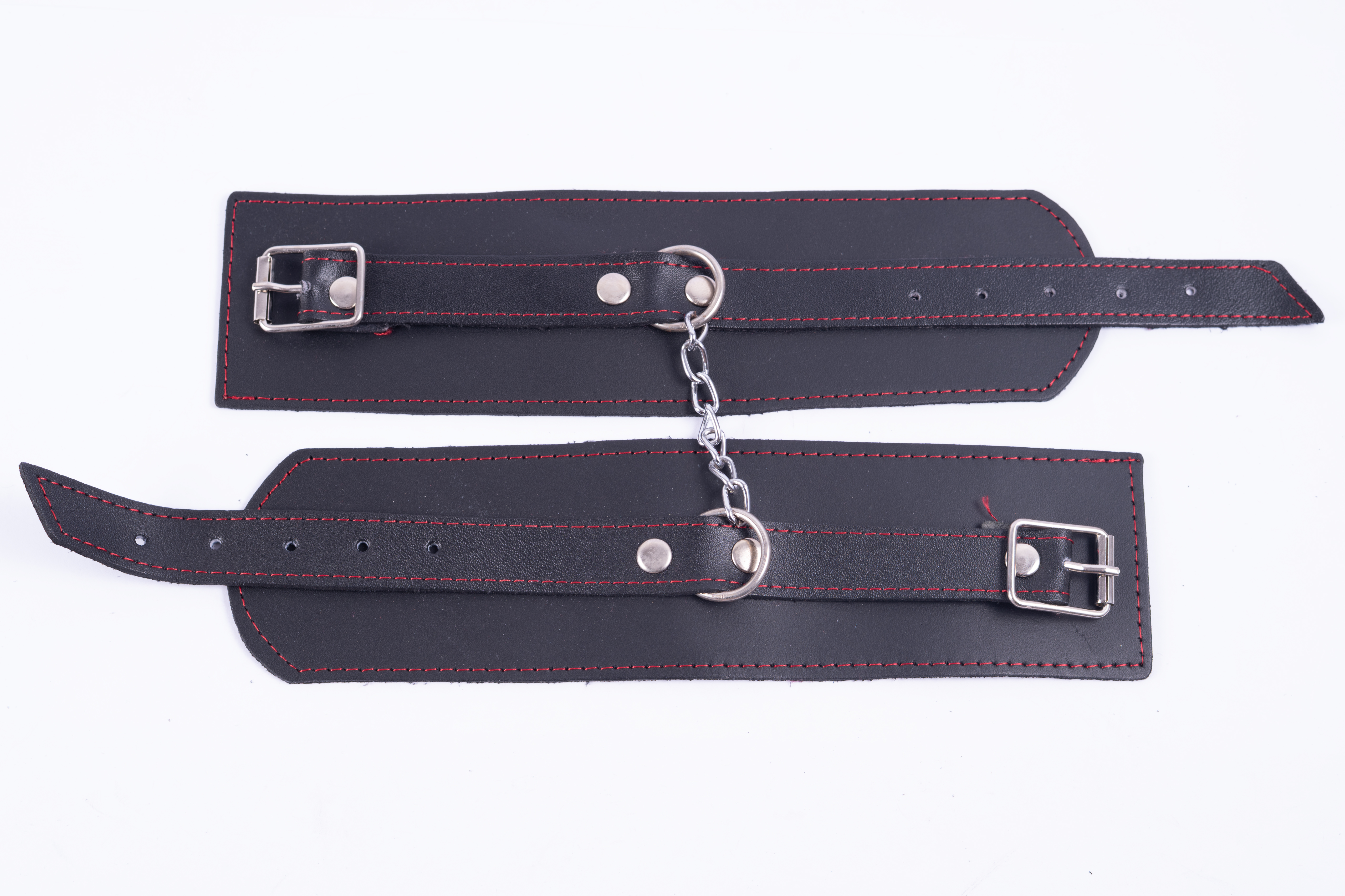 Esposas para manos y/o tobillos. Son ajustables, aptas para manos de hombre o de mujer, cómodas, muy resistentes y confeccionadas en cuero genuino con costuras reforzadas.