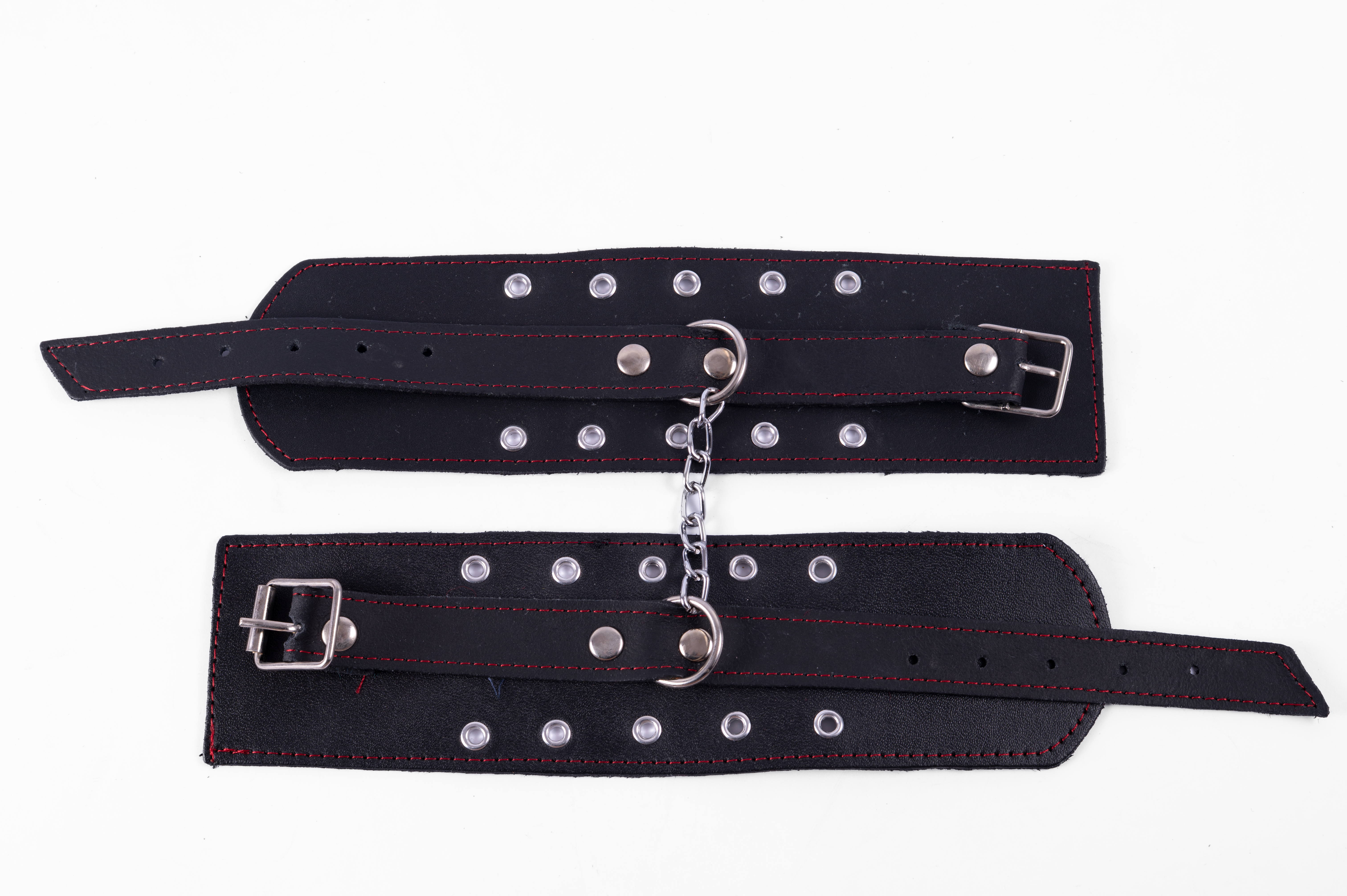 Si lo que quieres es sentirte fuertemente atado y notar en tus muñecas el cuero, estas esposas son para vos. Diseño elegante con tachas decorativas y hebillas de metal que permiten un buen ajuste. Unidas con cadena.
