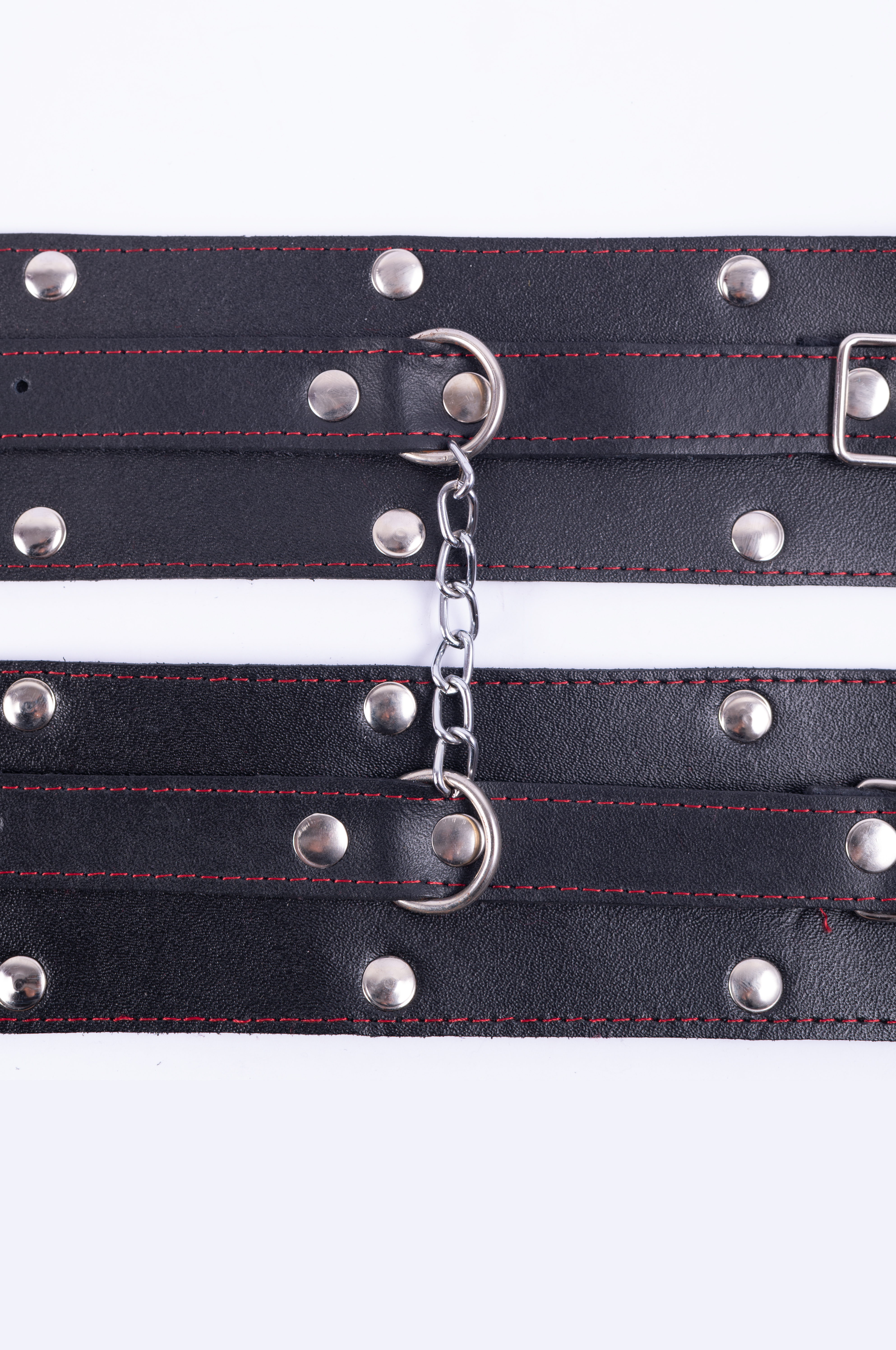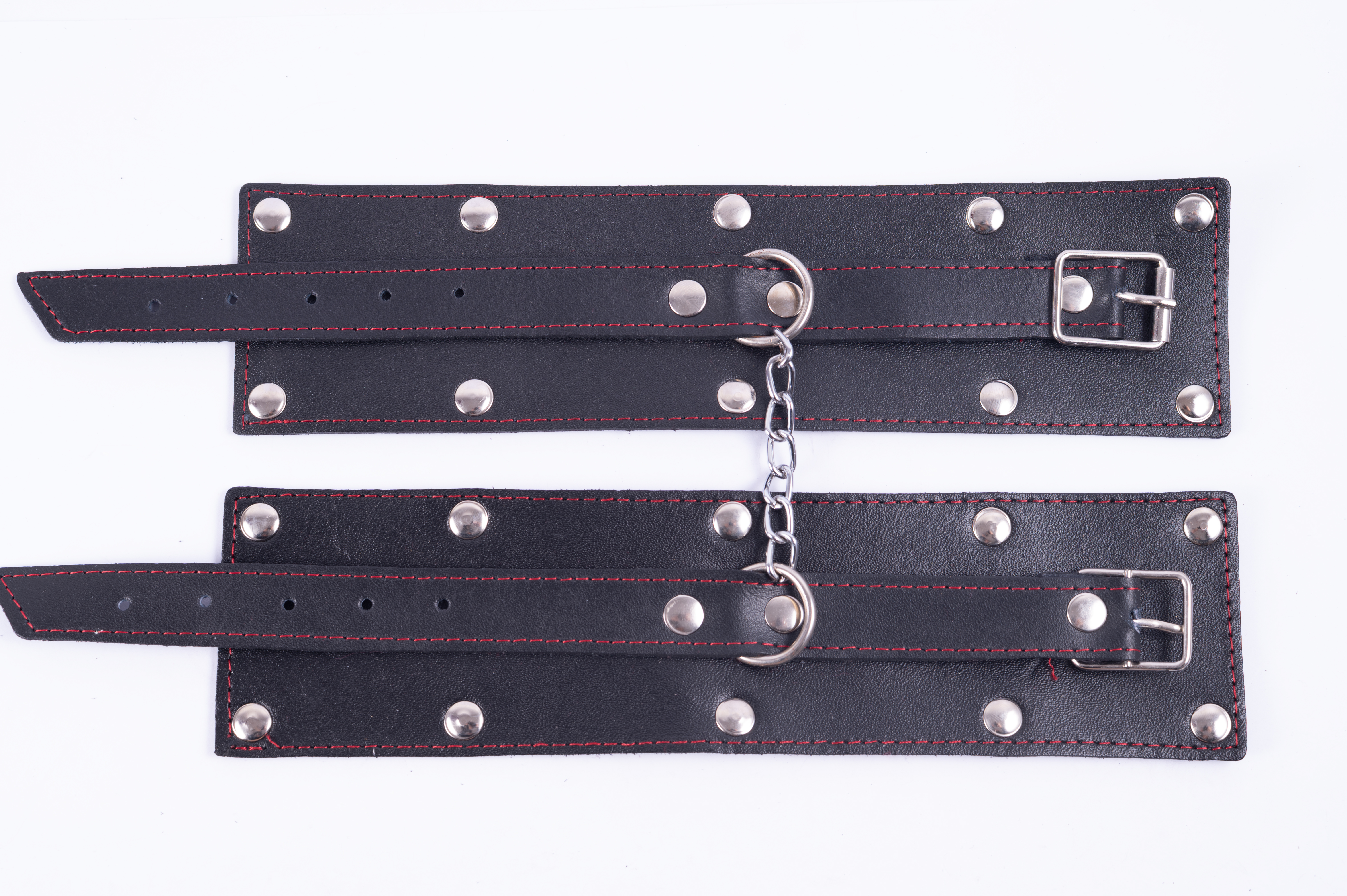 Si lo que quieres es sentirte fuertemente atado y notar en tus muñecas el cuero, estas esposas son para vos. Diseño elegante con tachas decorativas y hebillas de metal que permiten un buen ajuste. Unidas con mosquetones.